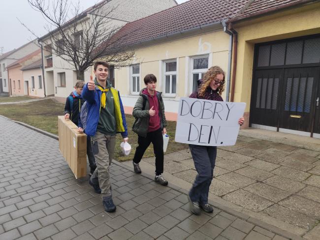 V lednu se nám na schůzce opět objevila cedule Dobrý den!Protože i když jedete kolem v autě, na kole, nebo stojíte na protějším chodníku, i tak vám chceme popřát dobrý den. Na schůzce jsme potom batikovali trička a hledali souhvězdí. Přidat komentář
